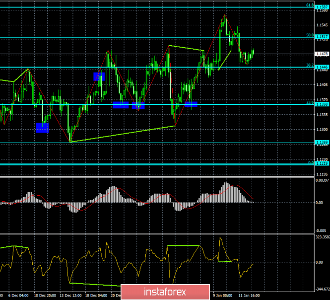 Пара EUR/USD выполнила разворот в пользу европейской валюты, не доходя до уровня коррекции 38,2% - 1,1446, и начала процесс роста в направлении коррекционного уровня 50,0% - 1,1517. Назревающих дивергенций 15 января не видно ни у одного индикатора. Отбой курса пары от уровня Фибо 50,0% позволит трейдерам рассчитывать на разворот в пользу валюты США и возобновление падения в направлении уровня 38,2%. Закрытие пары под уровнем 38,2% сработает в пользу продолжения падения в направлении следующего уровня Фибо 23,6% - 1,1358.