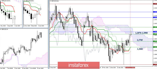 Основное внимание сейчас направлено на ожидание результата взаимодействия от встречи с важными сопротивлениями. Центром притяжения является зона 1,2870 – 1,2900 (недельный Киджун + месячный Фибо Киджун), границы расширены дневным облаком (1,2957 – 1,2838). Вчера, как и предполагалось, преодолеть уровни с первой попытки не удалось, пара закрыла прошлые сутки под сопротивлениями. В настоящий момент возможность развития отбоя от встреченных уровней по-прежнему сохраняется. Важные поддержки, в случае если пара покинет дневное облако, сегодня можно отметить на 1,2765 (недельный Фибо Киджун) и 1,2683 (недельный Тенкан + дневной крест).