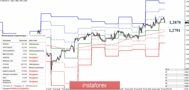 Индикаторный анализ в настоящий момент на Н1 отдаёт предпочтение продажам. Медведи сейчас остановились у поддержки центрального Пивот-уровня (1,2870), пробой уровня откроет дорогу к недельной долгосрочной тенденции, которая в настоящий момент находится на 1,2791. Закрепление ниже позволит говорить о новых перспективах для игроков на понижение, так как от встреченных важных сопротивлений (1,2870-1,2900) будет сформирован полноценный отбой. Повышательными ориентирами в случае продолжения подъёма сегодня являются R1 (1,2922), R2 (1,2982), R3 (1,3034).