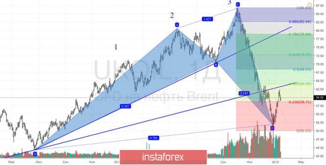 Технически после достижения промежуточного таргета на 78,6% по паттерну «Акула» пошел закономерный откат в направлении 23,6%, 38,2% и 50% от волны CD. Если «быкам» удастся удержать котировки Brent выше $58,7 за баррель, риски развития коррекции к нисходящему тренду возрастут.