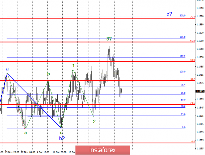 Торги во вторник, 15 января, закончились для пары EUR/USD снижением на 60 б.п. Таким образом, текущий повышательный участок тренда, берущий свое начало 12 ноября, может принять более неоднозначный и сложный вид. Волна 4 в с принимает достаточно глубокий вид, и хотя вся волна с может принять вид диагонального треугольника, такое сильное снижение инструмента и поддержка этого падения новостями может привести к продолжению падения и преобразованию волновой картины. Важным уровнем теперь является уровень 23,6% по малой сетке Фибоначчи. Над ним сохраняются шансы на построение новой восходящей волны, 5, в с.