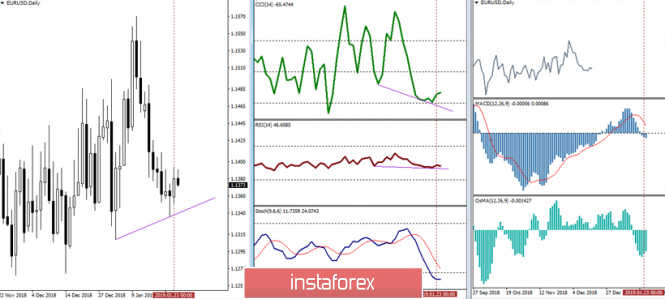 На индикаторах CCI и RSI сформированы расхождения с графиком цены. Расхождение является скрытой бычьей дивергенцией. В результате можно констатировать, что индикаторы CCI и RSI отдают предпочтение продолжению дневного бычьего тренда. Поэтому если сила текущих поддержек 1,1370-50 сможет удержать пару от падения, то возможно продолжение подъёма, благодаря которому сформировано данное расхождение.