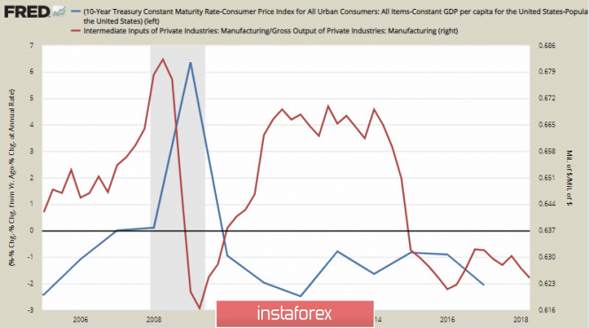 За счет чего темпы роста ВВП сохраняются высокими? Уж всяко не за счет новой политики администрации Трампа, поскольку реальная экономика деградирует с осени 2014 г. Этот момент хорошо отслеживается по отношению затрат на промежуточные товары в промышленном секторе к общему доходу (красная линия). Другими словами, рост реального ВВП, позволяющий обслуживать госдолг, полностью зависит от роста в других секторах экономики – недвижимость, страхование, финансы, которые в значительной степени зависят от устойчивости доллара и его востребованности на глобальном уровне.