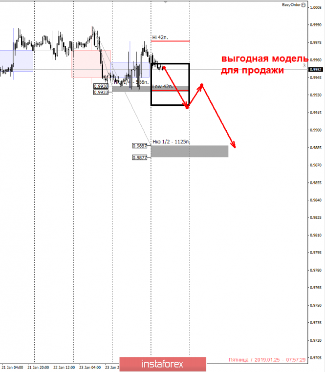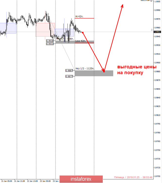 Формирование локальной зоны накопления на паре происходит в пределах месячной КЗ. Это позволяет рассматривать продажи после закрепления цены ниже НКЗ 1/4 0.9938-0.9933. Если сегодняшняя американская сессия закроется ниже указанной зоны, то следующей целью снижения станет НКЗ 1/2 0.9887-0.9877, где будет первая точка фиксации продаж. Короткая позиция из пределов месячной КЗ всегда имеет вероятность отработки выше 70%.