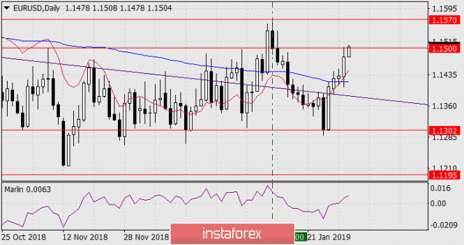 На текущий момент мы видим, что цена пробивает целевой уровень 1.1500. На графике Н4 сигнальная линия осциллятора Марлин развернулась вверх от нулевой линии. Ждём евро на следующем целевом уровне 1.1570 – это максимум 10 января и минимум 19 июля прошлого года.