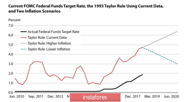 Если исходить из принципов, заложенных в формулу Тейлора, то целевая ставка по состоянию на конец 2018 г. должна составлять 4.75%, отсюда и уверенность рынков в течение довольно долгого времени в том, что ставка будет расти, а доходность номинированных в долларах активов – повышаться. В зависимости от разного поведения инфляции расчетный уровень по ставке должен уйти выше или ниже, но в любом случае должен был быть выше текущего уровня.