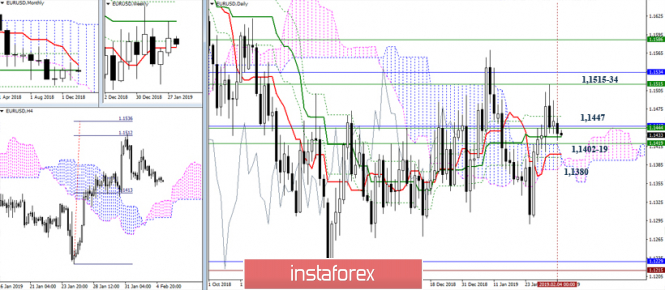 На младших таймфреймах преимущество, и поддержка индикаторов по-прежнему принадлежит игрокам на понижение. Понижательными ориентирами служат сейчас поддержки S1 (1,1419), S2 (1,1403), S3 (1,1382). Данное расположение уровней подтверждает выводы Ишимоку. Район перемены настроений сегодня обозначен зоной 1,1440-50 (центральный Пивот-уровень + недельная долгосрочная тенденция). Закрепление выше может способствовать восстановлению и усилению бычьих настроений.