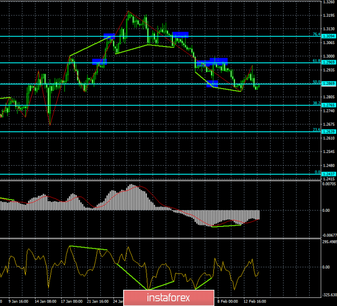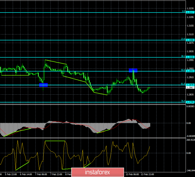 Пара GBP/USD на 4-часовом графике почти доросла до уровня коррекции 61,8% - 1,2969, но выполнила разворот в пользу американской валюты и закрытие под уровнем Фибо 50,0% - 1,2869. Таким образом, 14 февраля падение котировок может быть продолжено в направлении уровня коррекции 38,2% - 1,2765. Назревающих дивергенций сегодня нет ни у одного индикатора. Закрепление курса пары над уровнем Фибо 50,0% сработает в пользу валюты ЕС и начала нового роста в направлении уровня коррекции 61,8%.