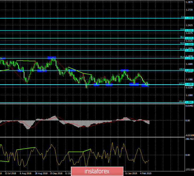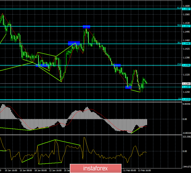 Пара EUR/USD на 4-часовом графике выполнила второй разворот в пользу европейской валюты, после отбоя от уровня 1,1269 и образования бычьей дивергенции. Таким образом, пара сейчас имеет определенный шансы на рост в направлении коррекционного уровня 23,6% - 1,1358. Назревающих дивергенций 15 февраля не наблюдается ни у одного индикатора. Закрытие котировок под лоу дивергенции сработает в пользу возобновления падения пары в направлении уровня Фибо 0,0% - 1,1219.