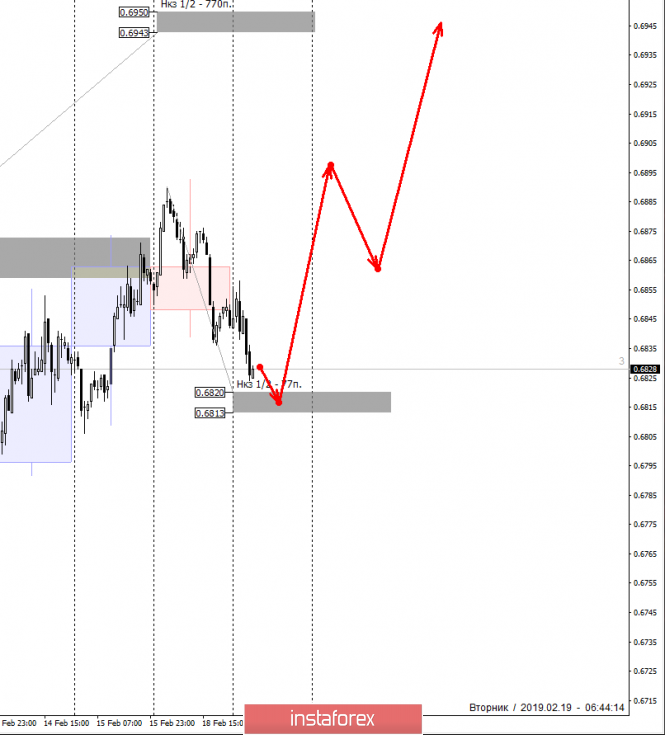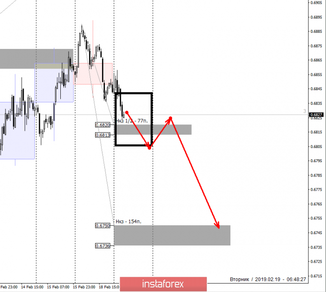 Альтернативная модель получит развитие в случае, если пара сможет пробить и закрепиться ниже НКЗ 1/2 0.6820-0.6813. Это приведет к формированию медвежьего импульса и появлению новых целей на нисходящем движении. Первой такой целью станет недельная КЗ 0.6750-0.6736, которая будет совпадать с зоной февральского предложения.