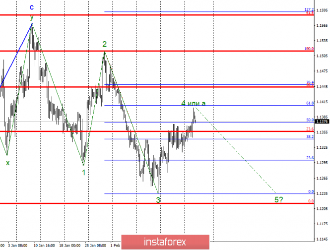 Торги во вторник, 26 февраля, завершились для пары EUR/USD повышением на 30 б.п. Таким образом, предполагаемая волна 4 продолжила свое построение и вышла к уровню 61,8% по малой сетке Фибоначчи. Неудачная попытка прорыва этого уровня укажет на готовность пары к построению понижательной волны с целями, расположенными около 12 фигуры. В то же время весь участок тренда, берущий свое начало 10 января, принимает вид треугольника, поэтому его волна 4 может получиться гораздо более глубокой, чем она выглядит сейчас. Вчера Джером Пауэлл заявил, что ФРС будет проявлять сдержанность в вопросе повышения ставки, так как в последнее время появились дополнительные риски и неопределенности. Эти слова могут поддержать именно евро.