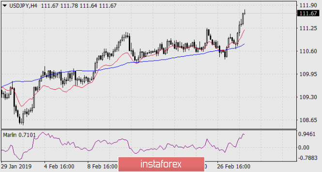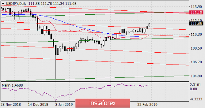 Японская йена нашла в себе силы преодолеть незрелость медвежьих дивергенций, что мы и предполагали в прошлом обзоре от 27 февраля. Цена развернулась вверх вчера от линии Крузенштерна четырёхчасового графика. Осцилляторы марлин на обоих таймфреймах указывают на рост, теперь у йены нет преград при движении к целевому уровню 113.15 - точке пересечения двух линий ценовых каналов.