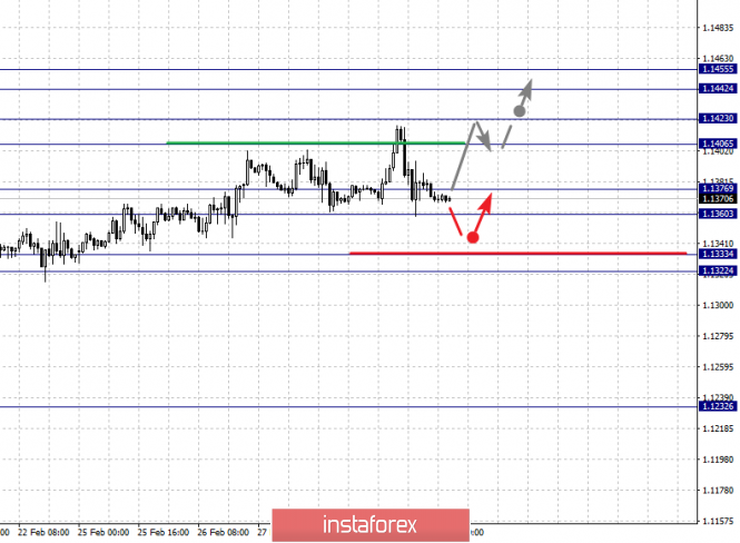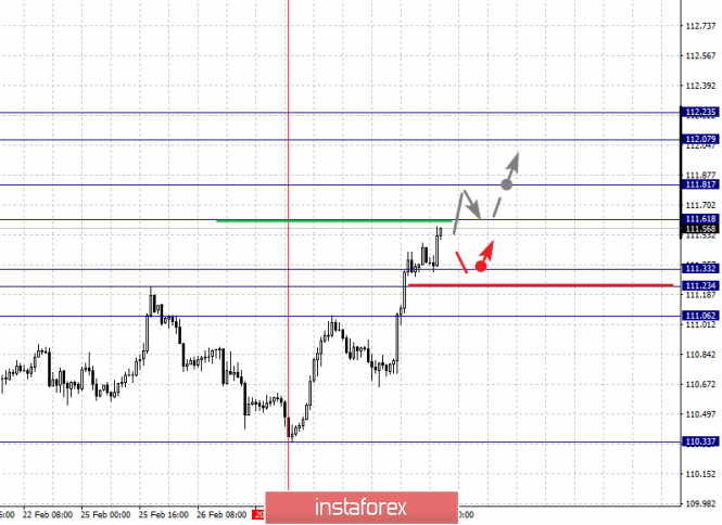 По паре Евро/Доллар цена вошла в равновесное состояние, продолжения движения кверху ожидаем после пробоя 1.1406, уровень 1.1360 ключевая поддержка. По паре Фунт/Доллар развитие восходящей тенденции в масштабе Н1 возможно после пробоя 1.3340, на текущий момент цена находится в коррекции. По паре Доллар/Франк цена оформила локальную структуру для нисходящей тенденции, уровень 0.9997 ключевая поддержка. По паре Доллар/Иена продолжения движения кверху ожидаем после пробоя 111.61. По паре Евро/Иена развития восходящей тенденции от 22 февраля ожидаем после пробоя 127.00. По паре Фунт/Иена основное развитие восходящей тенденции от 22 февраля должно произойти после прохода шумового диапазона 147.75 – 148.21.
