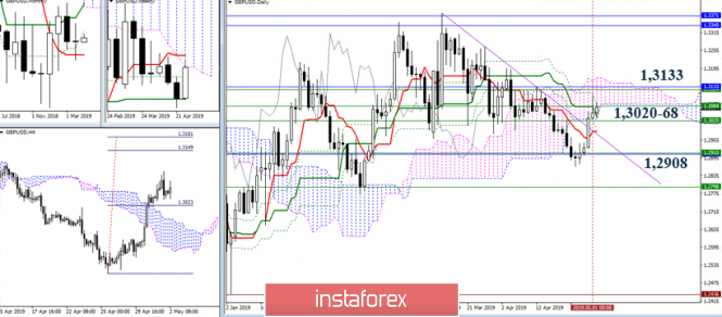 Игроки на повышение сумели исполнить хороший коррекционный подъём, закрыв апрель весьма оптимистично для себя. Сейчас у них на повестке дня две наиболее важные задачи – ликвидация дневного мёртвого креста (1,3071) и закрепление в недельном облаке (1,3068). Следующим значимым рубежом в этом направлении будет являться выход за пределы дневного облака и преодоление сопротивлений недельного Тенкана (1,3123) и месячного Фибо Киджуна (1,3133), а также отработка повышательной цели на пробой облака Н4. Наиболее значимой зоной поддержки сейчас является облако Н4, усиленное уровнями старших таймов 1,3020 (недельный Фибо Киджун) – 1,2983 (дневной Тенкан). Надёжное закрепление ниже вернёт актуальность медвежьим планам по тестированию и пробою объединённых поддержек месячного Тенкана (1,2908) и недельного Киджуна (1,2908).