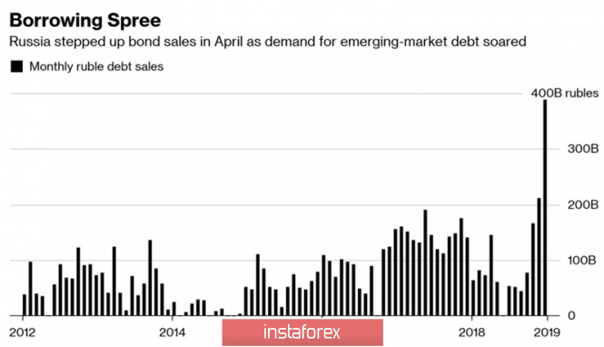 Благодаря активности carry-трейдеров рубль сумел закрыть в зеленой зоне против доллара США три из последних четырех месяцев. Высокий глобальный аппетит к риску и падение волатильности на Forex до минимальных отметок с 2014 позволило Минфину РФ с блеском реализовать план по привлечению денег в рамках эмиссии облигаций. В апреле масштабы выпуска оказались рекордными (400 млрд руб., или $6,2 млрд) и в четыре раза превысили среднемесячный показатель. В условиях профицита бюджета Москва делает запасы с целью снижения негативных эффектов от потенциальных санкций против российского рынка долга со стороны США.