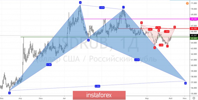 Технически в случае активации паттерна Гартли, у «быков» по анализируемой паре появится возможность сходить к его таргету на 78,6%. Он соответствует отметке 66,4, Правда, пока USD/RUB держится ниже 66,5, ситуацию продолжают контролировать «медведи».