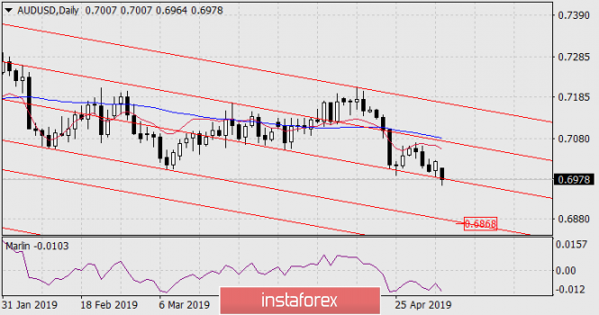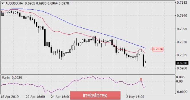 Формально цена ушла под линию ценового канала на дневном графике и сигнальная линия осциллятора марлин развернулась от границы, разделяющей зону роста от зоны падения, и перед ценой открылась цель 0.6868, но собственно незакрытое окно оставляет вероятность роста к линии Крузенштерна четырёхчасового масштаба в район 0.7026. С другой стороны, как, например, в ноябре прошлого года, когда цена ушла в сторону разрыва 120 пунктов, прежде чем развернуться на его закрытие, мы можем увидеть подобную картину и в текущей ситуации, то есть сначала снижение к последующей вложенной линии ценового канала и только затем рост на перекрытие гэпа.