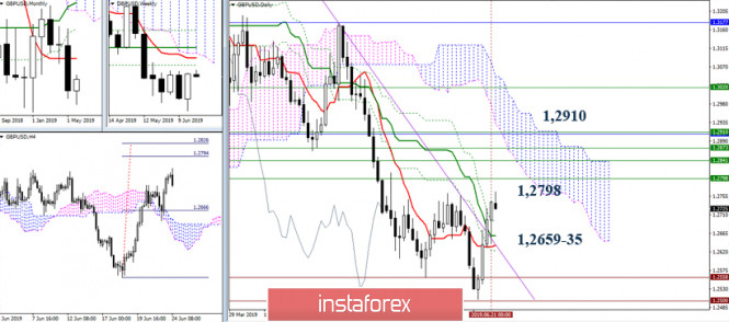 Оттолкнувшись от важных поддержек сначала в районе 1,1186, далее 1,1280-84, пара продолжила подъём и приступила к тестированию сопротивлений, которые ранее были обозначены на уровнях 1,1366 (месячный Тенкан) – 1,1393 (недельный Фибо Киджун). Данные уровни отвечают за распределение сил на самых старших временных интервалах. Краткосрочная поддержка на месячном графике и ликвидация недельного мёртвого креста помогут игрокам на повышение формировать дальнейшие планы на более длительные периоды времени. Следующий повышательный ориентир на старших таймах сейчас расположен в районе 1,1417-51 (цель на пробой дневного облака + нижняя граница облака недельного).