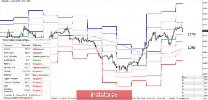 В настоящий момент на младших таймах пара находится в нисходящей коррекции. Технические индикаторы уже успели на Н1 перестроиться на активную поддержку игроков на понижение, но ключевые уровни поддержки, в случае тестирования, будут пока пытаться отстаивать интересы игроков на повышение. За начальное бычье преимущество отвечает центральный Пивот-дня, расположенный сейчас на 1,2709, далее в работу вступит недельная долгосрочная тенденция, она находится на 1,2633. Формирование отбоя от встреченных поддержек вернёт актуальность повышательным ориентирам классических Пивот-уровней 1,2777 – 1,2813 – 1,2881.