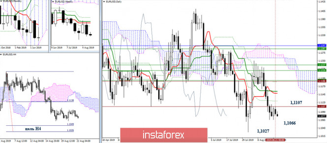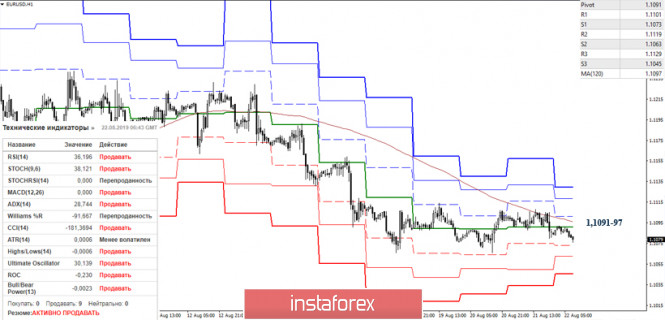 Вчера игроки на повышение так и не смогли преодолеть сопротивление недельной долгосрочной тенденции – ключевого уровня, отделяющего коррекционное движение от будущего тренда на Н1. Сегодня недельная долгосрочная тенденция (1,1097) объединила свои усилия с центральным Пивот-уровнем дня (1,1091), данные уровни находятся в непосредственной близости от графика цены. Закрепление выше и преодоление исторического уровня 1,1107 может позволить игрокам на повышение с новыми силами возродить восходящее коррекционное движение. Если пара продолжит работу ниже 1,1091-97, то действующее преимущество медведей будет сохраняться. Их дальнейшие планы будут связаны с минимальными экстремумами 1,1066 и 1,1027.