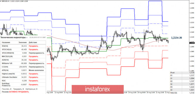На младших таймах игроки на понижение в очередной раз стремятся завладеть ключевыми поддержками младших таймов (1,2130-34 центральный Пивот-уровень + недельная долгосрочная тенденция). Но уровни находятся в непосредственной близости от графика цены, поэтому о явном, надёжном результате и преимуществах говорить еще рано. Закрепление выше 1,2130-34 вернёт ожидание возможного развития восходящей коррекции. Ориентирами внутри дня, после обновления вчерашнего максимума (1,2179), выступят сопротивления классических Пивот-уровней 1,2197 (R2) и 1,2220 (R3). Закрепление ниже вчерашнего дневного минимума (1,2111) и преодоление поддержки S1 (1,2094) откроет дорогу к S2 (1,2071) и S3 (1,2031).