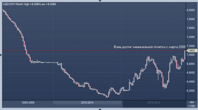 По наблюдениям аналитиков, четверг, 22 августа, начался для китайской валюты с роста. Пара USD/CNY держалась на отметке 7,0905, но после заявлений президента США Дональда Трампа о превосходстве Америки в торговой войне с КНР начала неуклонно снижаться. К настоящему моменту юань достиг минимальной отметки с марта 2008 года.