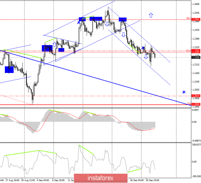 Пара GBP/USD 1 октября на 4-часовом графике выполнила откат от лоу, рост к коррекционному уровню 23,6% - 1,2293, но на текущий момент уже готова возобновить падение. Построен новый не слишком сильный нисходящий канал, в рамках которого и продолжается движение пары фунт-доллар. По-прежнему я ожидаю падение котировок пары, так как информационный фон остается негативным для фунта стерлингов.