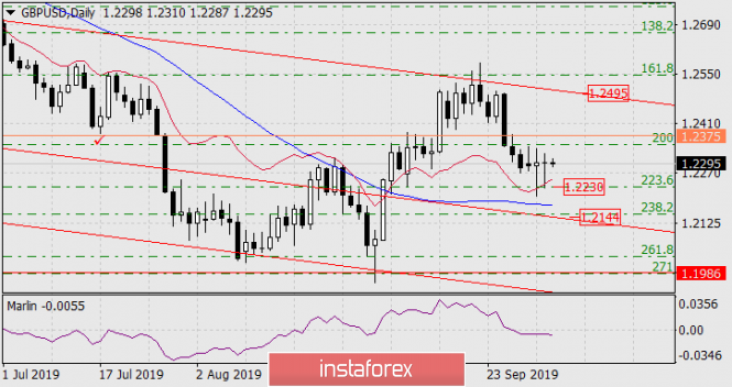 Британский фунт вчера во второй раз протестировал поддержку уровня Фибоначчи 223,6%, но в отличие от вторника импульс был слабее, день опять закрылся в районе открытия недели. Осциллятор Марлин на дневном графике продолжает потихоньку снижаться.