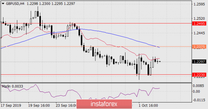 На четырёхчасовом графике цена также остановилась у сопротивления линии баланса. Тенденция сохраняется понижающейся не смотря на выход осциллятора Марлин в зону роста, так как он может указывать на возможный рост пока не выше линии Крузенштерна (1.2375). Выход цены над данную линию уже может говорить о более серьёзном настрое рынка – к линии ценового канала с целью 1.2495.