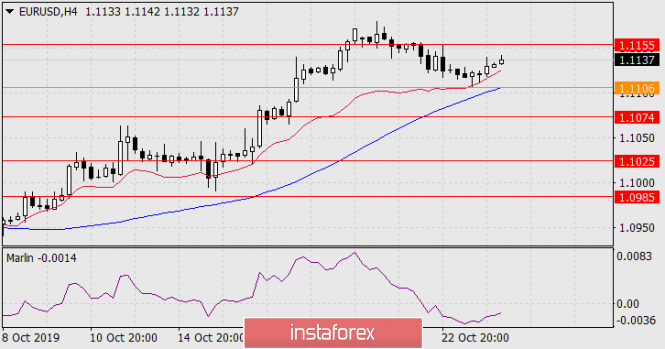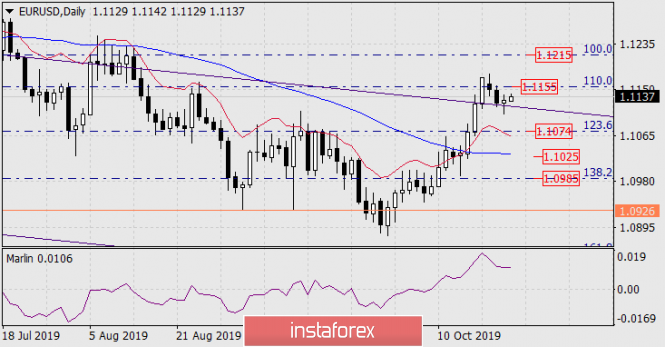 Вчера весь день евро продержался на линии синего нисходящего ценового канала в ожидании сегодняшнего, последнего для Марио Драги, заседания ЕЦБ. Мы полагаем, что заседание будет нейтральным, всю подготовительную работу для своей преемницы «Супермарио» уже сделал. Общий настрой у рынков по этому поводу позитивный. Ранее днём будут опубликованы европейские PMI за октябрь. По ним прогноз оптимистичный: деловая активность в производственном секторе ожидается ростом с 45,7 до 46,1, в сфере услуг ожидается рост индекса с 51,6 до 51,9. В США, напротив, по экономическим индикаторам ожидается ухудшение: объём заказов на товары длительного пользования в за сентябрь прогнозируется -0,5% против 0,2% в августе, продажи новых домов в сентябре ожидаются понижением с 713 тыс до 710 тыс. Американский Manufacturing PMI за октябрь может понизиться с 51,1 до 50,7. Services PMI может подрасти, но не существенно: прогноз 51,0 против 50,9 ранее.