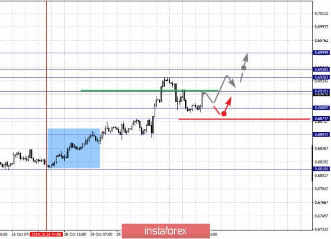 Краткосрочное нисходящее движение, возможно в коридоре 0.6888 – 0.6874, пробой последнего значения приведет к углубленной коррекции, здесь цель – 0.6854, этот уровень является ключевой поддержкой для верха.