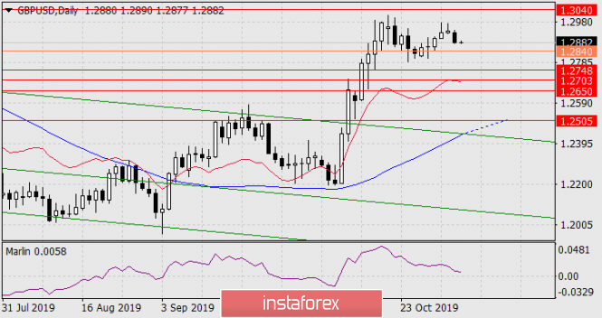 В понедельник фунт стерлингов снизился на 56 пунктов под общим давлением американского доллара. Сигнальная линия осциллятора Марлин на дневном масштабе уже близко подошла к границе с территорией «медведей». Её переход в отрицательную зону может совпасть с пересечением сигнального уровня 1.2840, который открывает ближайшую цель 1.2748 (вершина 27 мая и минимум 17 октября).