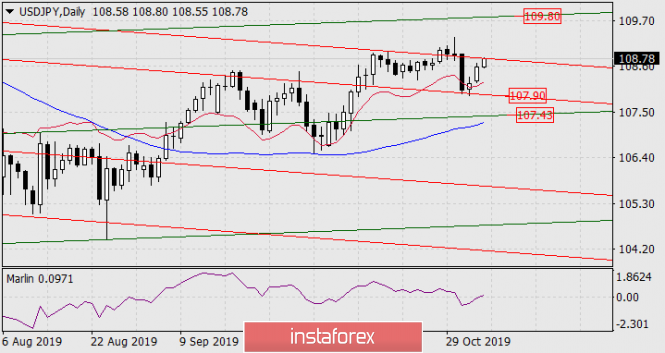 После отхода темы Брексит в тень, рынки с повышенной активностью стали реагировать на ход торговых переговоров США и Китая. От американских представителей появилась информация о вероятном подписании первой части договора в ноябре. В итоге S&P500 подрос на 0,37%, сегодня в азиатскую сессию Nikkei225 прибавляет 1,43%, а валютная пара USD/JPY с открытия недели подрастает на 60 пунктов. Цена вновь встретилась с сопротивлением вложенной линии ценового канала, над которой ей необходимо закрепиться для продолжения дальнейшего роста к ближайшей цели 109.80 – к сопротивлению зелёного ценового канала. Сигнальная линия осциллятора Марлин возвращается в зону роста, но есть риск разворота этой линии от границы с территорией роста вниз.
