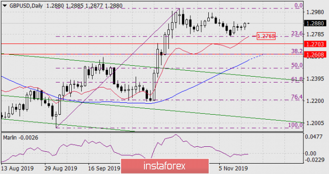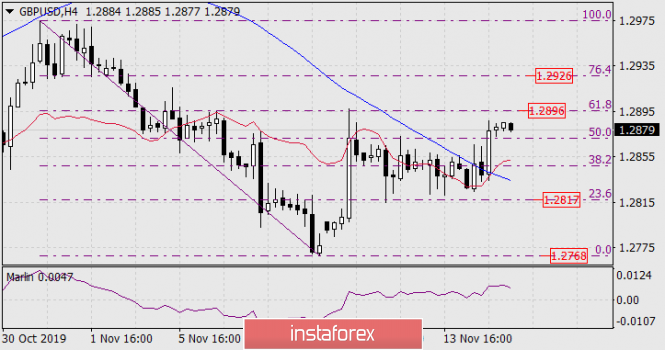 На четырёхчасовом графике цена закрепилась над линиями баланса и Крузенштерна, Марлин в зоне роста тенденции. Цена может доработать ветку роста к уровням Фибоначчи 61,8% (1.2896) и 76,4% (1.2926). Усиление снижения вероятно после преодоления поддержки линии Крузенштерна и уровня Фибоначчи 23,6% (1.2817).