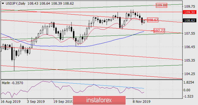 На четырёхчасовом графике цена под индикаторными линиями, осциллятор Марлин снижается, общая тенденция только понижающаяся. Закрепление цены над линией Крузенштерна (108.86) сможет развить, при других благоприятных обстоятельствах, рост с ближайшей целью 109.30 и в случае преодоления уровня выше к 109.86.