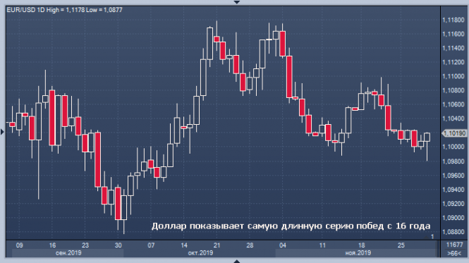В настоящее время гринбек вошел во вкус и девятую сессию подряд готовится продемонстрировать рост. По наблюдениям специалистов, подобного не случалось с 2016 года. Эксперты также обращают внимание на повышение индекса доллара на 0,1%. Это самый значительный уровень с 11 октября этого года. В наступившем месяце ожидается его прирост на 1,2%.