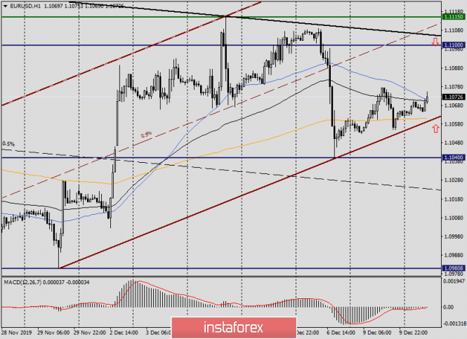 Характерно, что в обозначенной зоне находятся уровни 1.1080, 1.1100 и 1.1115. Также здесь проходит верхняя граница (чёрная линия) 4-часового канала и средняя (коричневая пунктирная канала часового). По моему мнению, есть все технические основания рассматривать продажи после подъёма цены в область 1.1080-1.1110. Дополнительным сигналом для открытия продаж станет появление в выделенной зоне свечных сигналов на снижение.