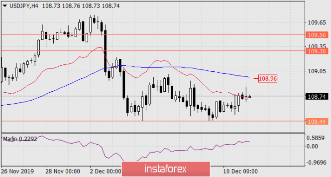 На графике Н4 сигнальная линия осциллятора Марлин в зоне роста. Данный фактор допускает продолжение роста цены, и преодоление сопротивления линии Крузенштерна (108.96) может продлить рост в диапазон 109.30/50. Снижение цены под сигнальный уровень 108.44 – минимум 9 и 4 декабря, открывает цель 107.60 – поддержку вложенной линии зелёного ценового канала. Вариант с понижением сохраняется основным.