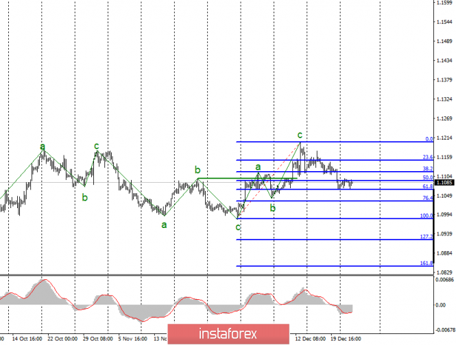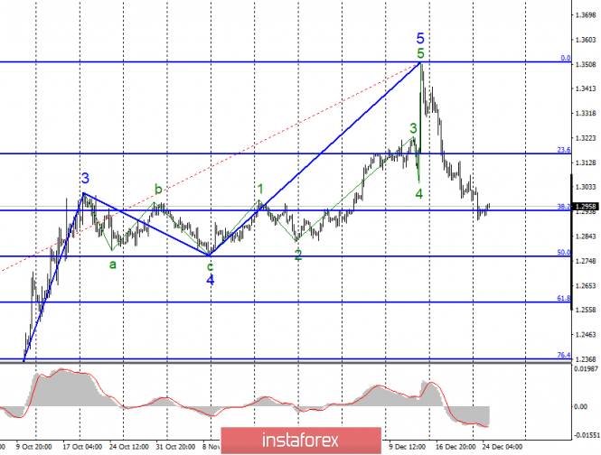 24 декабря пара EUR/USD завершила потерей нескольких базовых пунктов. Текущая волновая разметка остается прежней, так как за оставшееся время после публикации вчерашнего обзора при минимальной активности рынка никаких изменений произойти просто не успело. Таким образом, пара в некотором роде «застрял» между уровнями 50,0% и 61,8% по Фибоначчи и сохраняет отличные шансы на продолжение падения в рамках нового понижательного участка тренда.