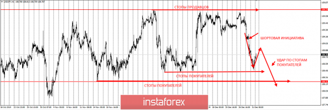 В связи с этим рекомендую работать на понижение с целью обновления этих уровней и фиксации на них прибыли. Эта идея будет актуально, пока цена находится в рамках шортовой инициативы, показанной на графике. Если рынок закрепится выше 50% от этой инициативы – шортовый сценарий отменится.