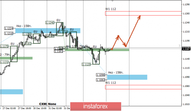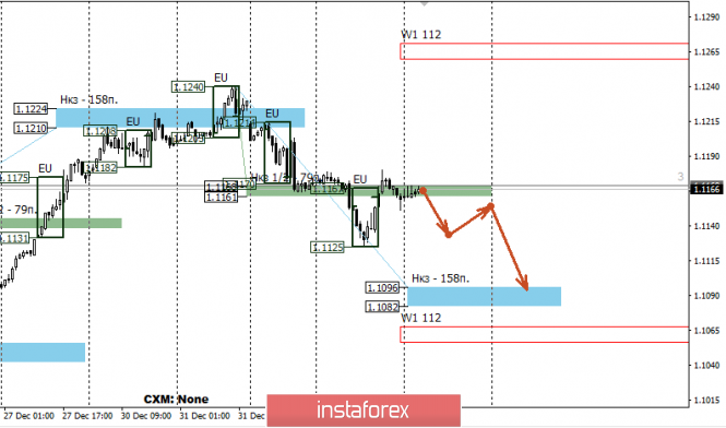 Пятничный пробой НКЗ 1/2 1.1169-1.1161 дает возможность рассматривать нисходящее движение наравне с ростом. Закрытие торгов прошлой недели произошло в пределах зоны, что говорит о формировании среднесрочной зоны накопления. Для подтверждения нисходящего импульса потребуется закрепление ниже уровня 1.1161 на сегодняшней американской сессии.