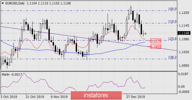 Прогноз по Non-Farm Employment Change за декабрь составляет 162 тыс после ноябрьского показателя в 266 тыс. Наш расчёт на основании еженедельных заявок по безработице даёт сопоставимую цифру в 155-170 тыс. Если ноябрьский показатель будет пересмотрен на понижение, что весьма вероятно из аналогичных расчётов (примерно, до 210 тыс), то получаемые значения окажутся оптимальными для продолжения роста на фондовом рынке, но недостаточными для рискового роста евро. При данном сценарии, принимаемого нами за основной, ждём дальнейшее понижение евро к ближайшей цели 1.1073 – к точке совпадения уровня Фибоначчи 123,6% с линией Крузенштерна на дневном графике.