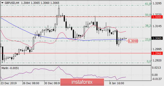 На четырёхчасовом графике вчера произошло закрепление цены под линией Крузенштерна – одна свеча всем телом была под этой линией, но на текущий момент цена уже выше линии Крузенштерна. Такой ложной сигнал также является признаком недолгого движения вниз, если оно будет (к нашей цели 1.2968). Осциллятор Марлин двигается вслед за ценой, сигналов не подаёт. Очередное закрепление цены под линией Крузенштерна, равно как и под уровнем коррекции 23,6%, откроет ближайшую цель 1.2968. Для движения цены к более низким целям (1.2820, 1.2730), которые отмечены на дневном масштабе, нужно быстрое движение цены вниз именно сегодня.