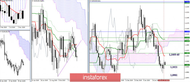 Всю неделю пара провела во взаимодействии с встреченной важной поддержкой 1,1021 (заключительный рубеж недельного золотого креста). Основной вопрос на сегодня заключается в том, удастся ли игрокам на повышение заявить о себе и добиться закрытия недели и месяца выше уровня 1,1021. Успех в данном направлении может помочь сдержать дальнейшее наступление медведей, сохранить неопределённость и торможение, а то и вовсе привести к последующему восстановлению позиций игроков на повышение. Ближайшие ориентиры сегодня остаются на своих местах, для медведей – 1,0981 (минимальный экстремум), для быков – 1,1055-65 (дневной Тенкан + недельный Киджун).