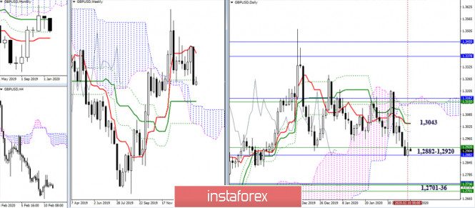 Встреча с нижней границей зоны консолидации (1,2882 – 1,2920 Фибо Киджуны недели и месяца) привела к торможению, что было ожидаемым. В результате сейчас решается главный вопрос. Он заключается в том, смогут ли игроки на понижение покинуть зону консолидации или же её влияние и притяжение вновь удержит пару от существенных перемен, а противостояние в пределах сложившихся границ консолидации будет продолжено.