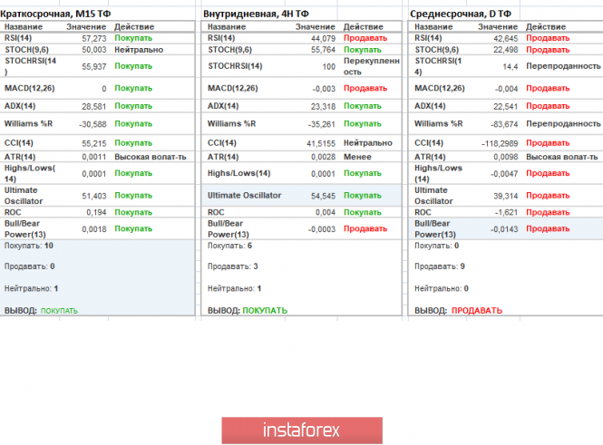 Анализируя разный сектор таймфреймов (ТФ), мы видим, что за счет процесса фиксации цены в новом такте показатели технических инструментов на минутных и часовых отрезках имеют переменный интерес. В то же время среднесрочный период неизменно сигнализирует о продажах.