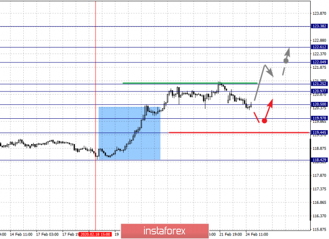 Краткосрочное нисходящее движение возможно в коридоре 120.50 - 119.97, пробой последнего значения приведет к углубленной коррекции, здесь цель – 119.44, этот уровень является ключевой поддержкой для восходящей структуры.
