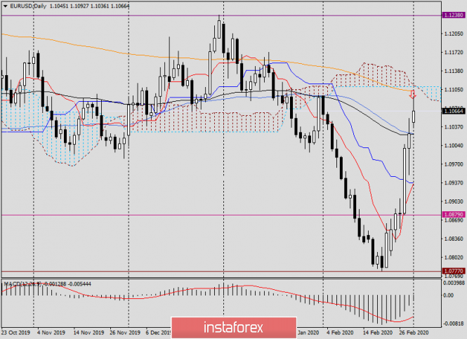 Переходим на дневной таймфрейм, где видим, что подъём 28 февраля на 1.1025 остановили 89 экспоненциальная и 50 простая скользящие средние. Однако сегодняшние торги открыли ГЭПом вверх, и в моменте завершения обзора пара торгуется вблизи 1.1065, и, судя по всему, собирается продолжить восходящее движение. Уже переписаны пятничные максимумы на 1.1053 и, в случае продолжения подъёма, следующей целью станет область 1.1095-1.1110, где уровень сопротивления и нижняя граница облака Ишимоку. Более дальний ориентир для игроков на повышение курса находится на 1.1125. Здесь находится 200 экспоненциальная скользящая средняя, которая может спровоцировать коррекционный откат. О таком развитии событий просигнализируют медвежьи модели японских свечей на четырёхчасовом и (или) часовом графиках.