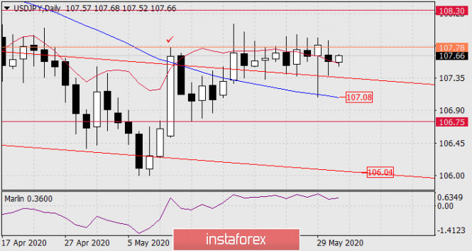 Решительного прорыва пары вверх, которого мы ожидали вчера, не произошло. Цена так и осталась под сигнальным уровнем 107.78. Минимум дня протестировал поддержку ценового канала, закрытие дня произошло над индикаторной линией баланса (daily). Но цена всё же не сдаётся. Сегодня мы ждём вторую попытку выхода над сигнальный уровень и дальнейший рост доллара против йены. Цель 108.30.