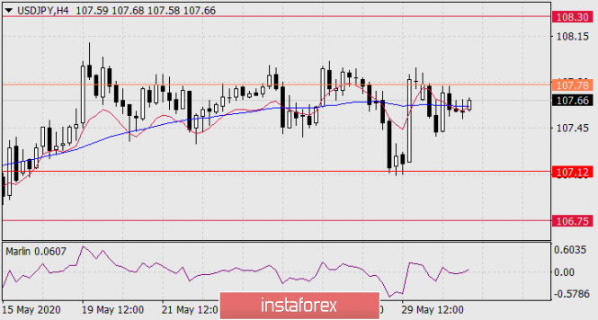 На четырёхчасовом графике цена на текущий момент преодолевает сопротивление индикаторной линии Крузенштерна (голубая линия), сигнальная линия осциллятора Марлин входит в зону положительных значений – в зону роста тенденции. Терпеливо ждём роста цены.